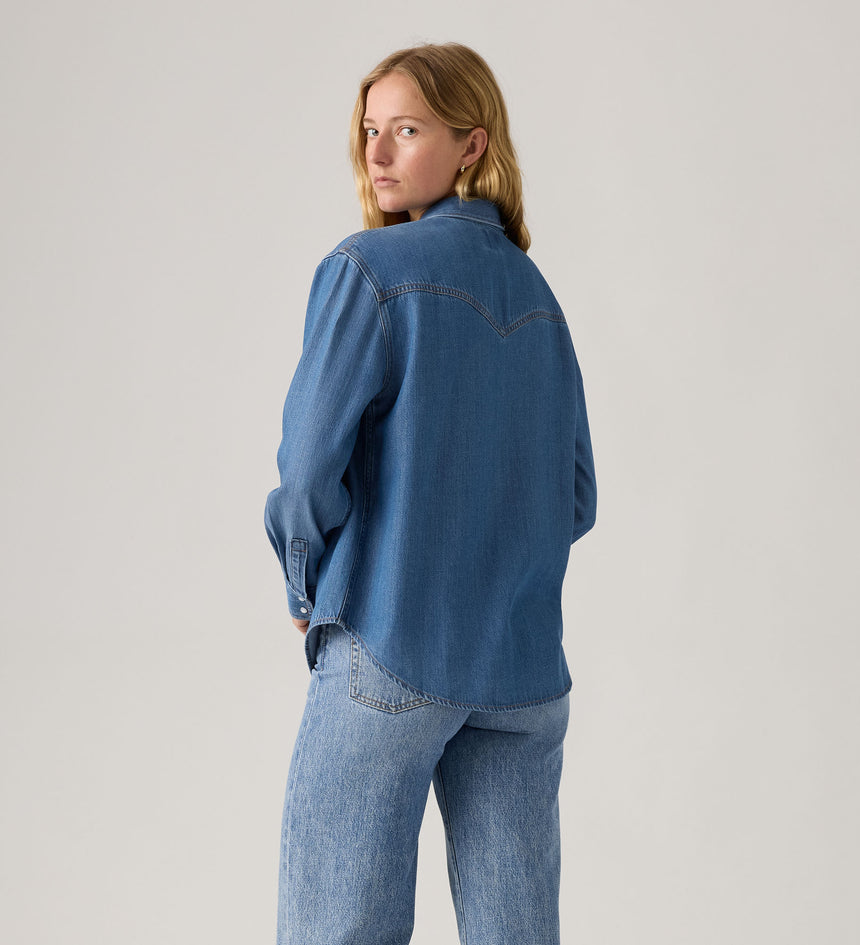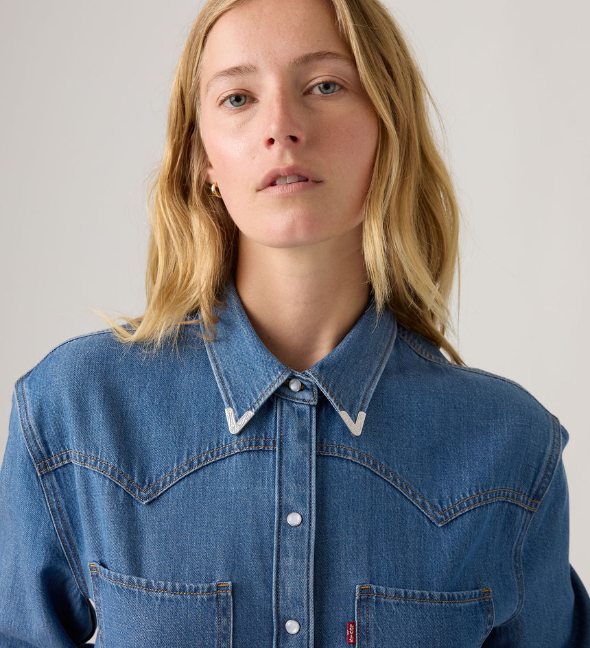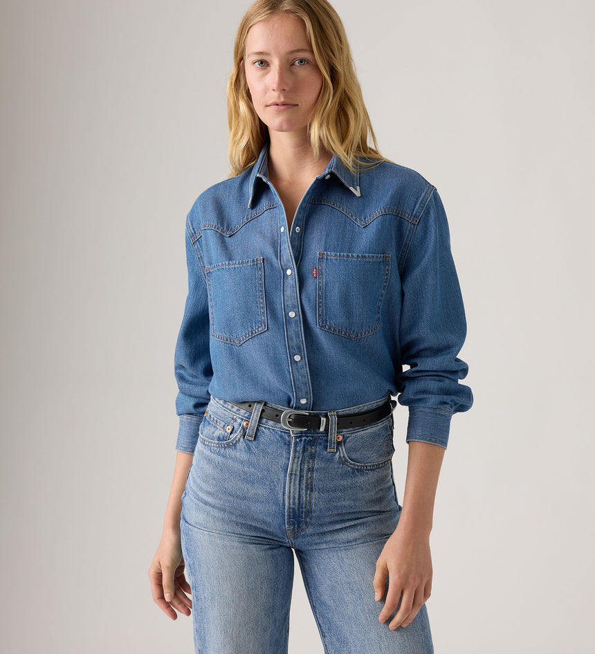 Cowboy boots not included. Our Teodora Western Shirt is a feminine take on a western staple, with a tipped collar, a classic snap-button front, two patch pockets, a relaxed fit and a western-inspired yoke design.