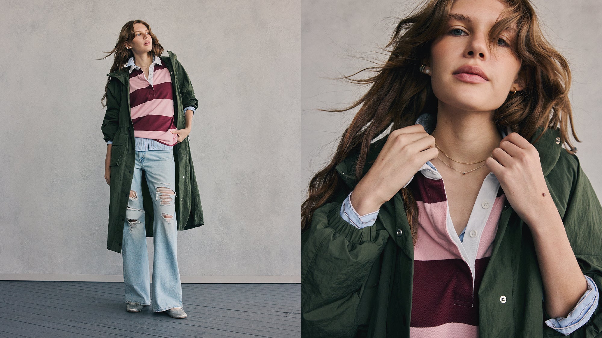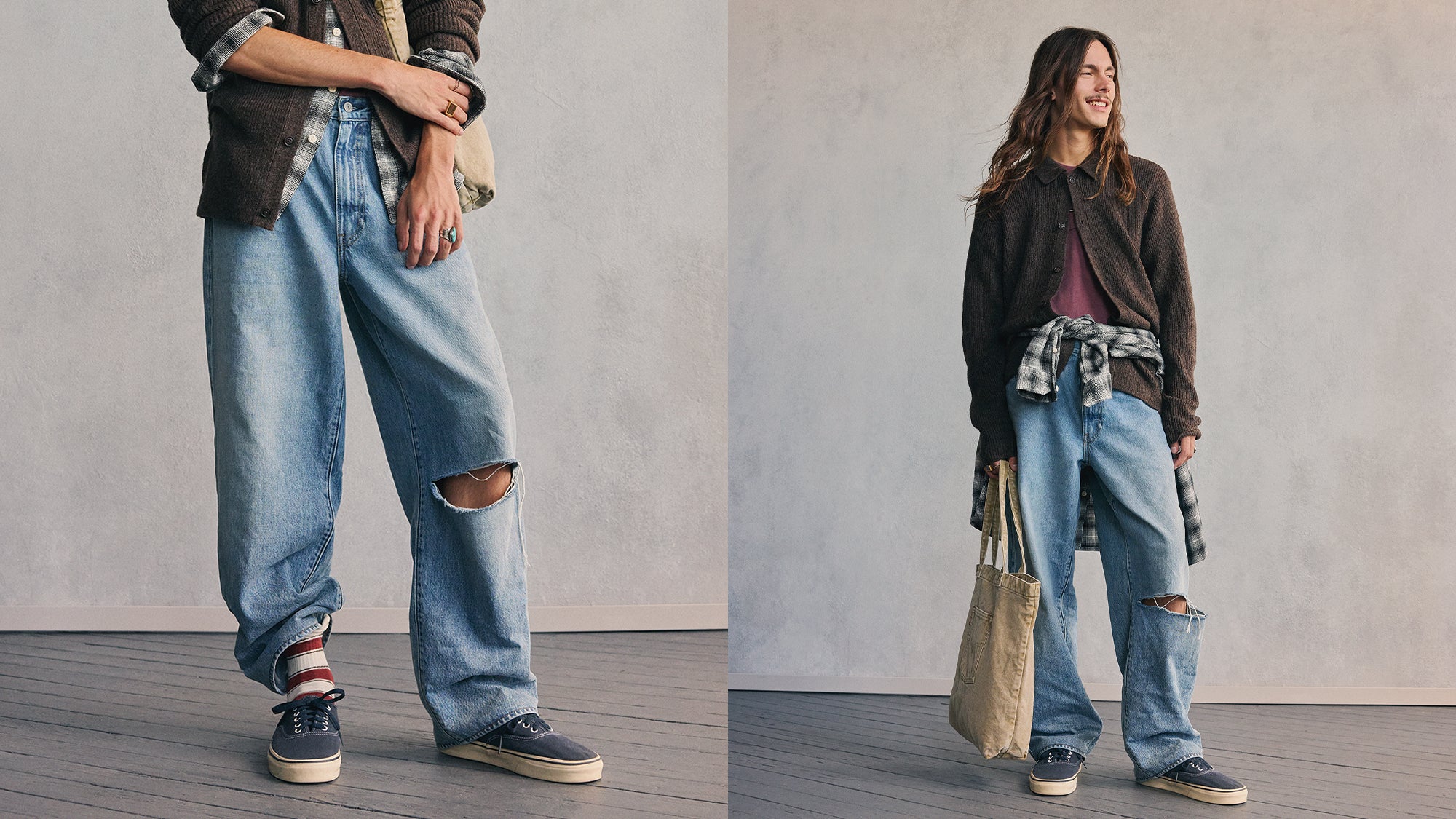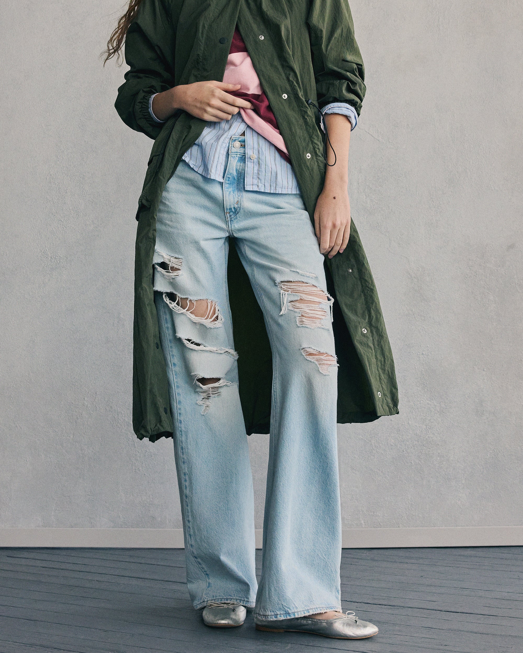 Jeans grunge dipadukan dengan atasan rapi. Motif mencolok bertemu warna netral yang lembut. Ada saatnya tampil kontras, ada saatnya tampil rapi.Kamu tidak terpaku pada satu gaya saja.