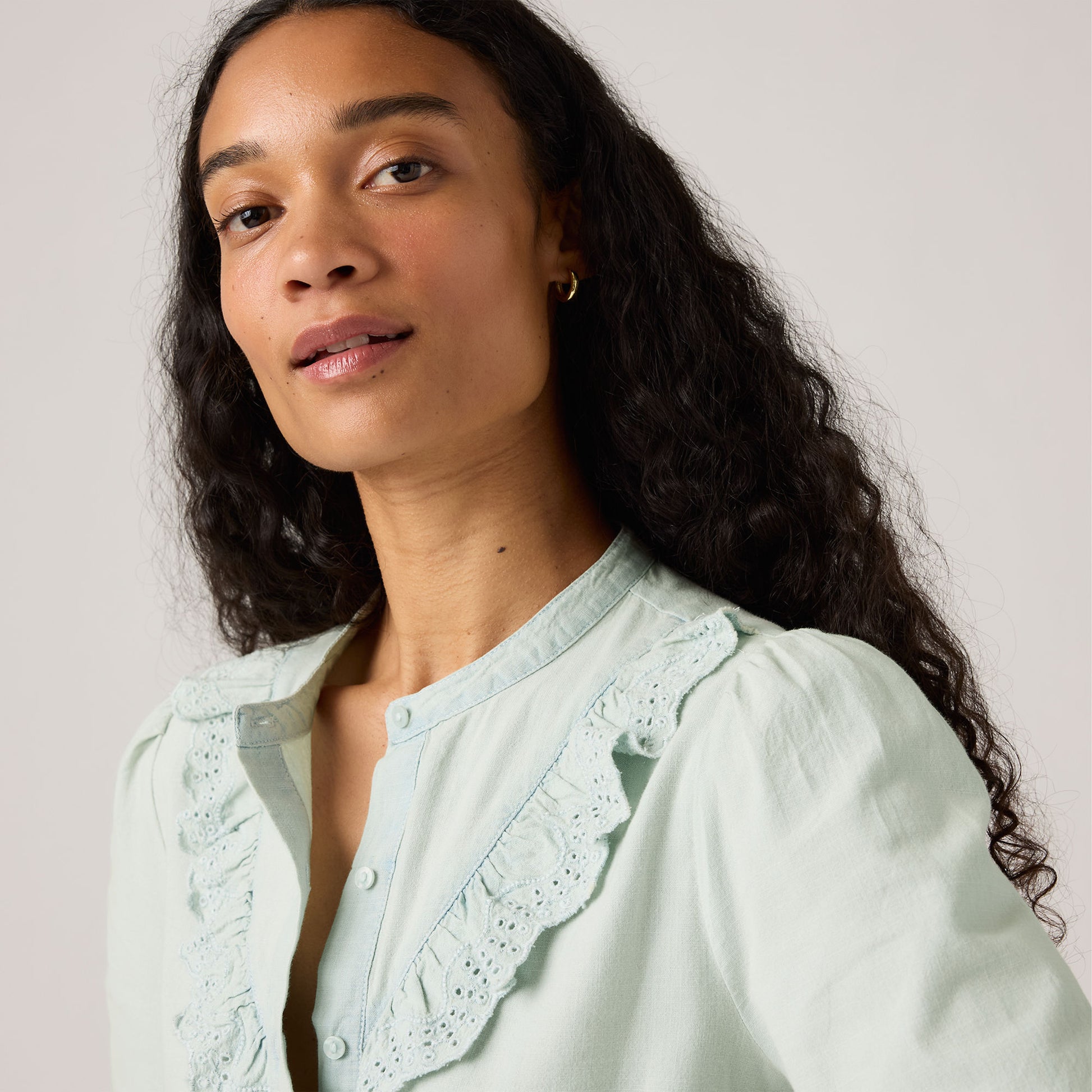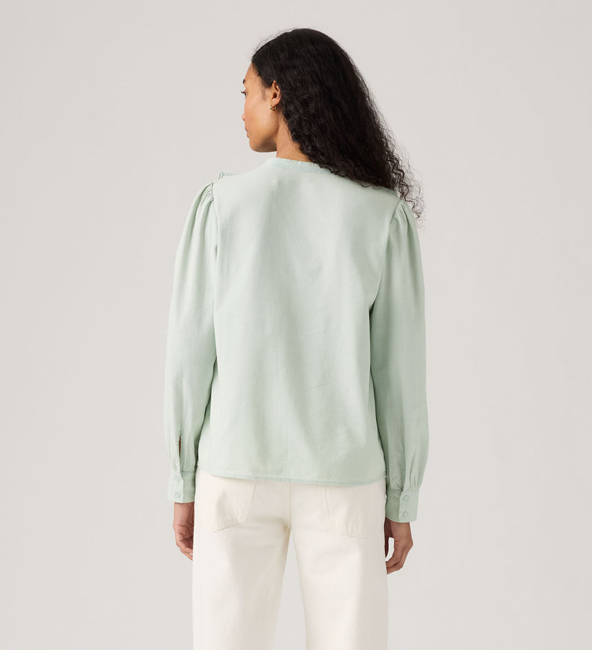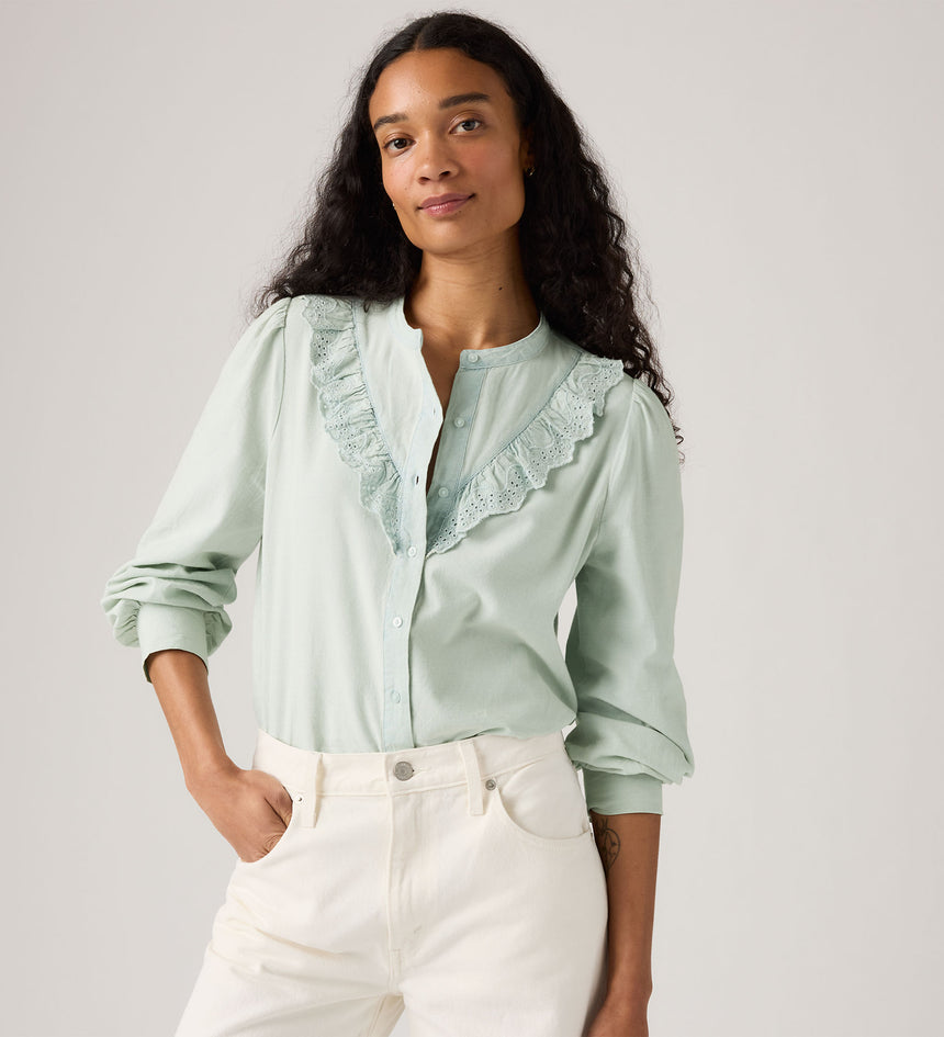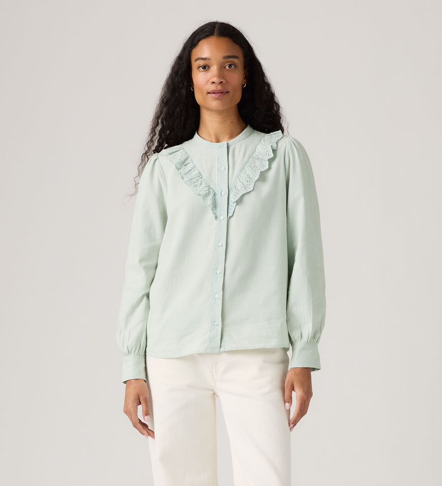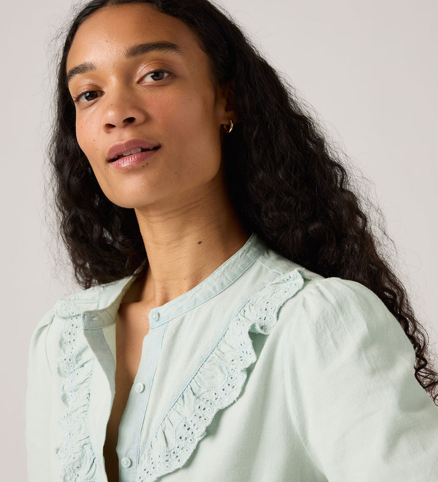 Jane Eyelet Blouse menghadirkan sentuhan manis yang memesona. Blus ini dirancang dengan kerah tinggi yang anggun, kancing depan klasik, lengan blouson yang romantis, dan detail eyelet yang menawan. Potongan yang mengalir lembut menciptakan siluet yang feminin, sementara detail eyelet memberikan sentuhan vintage yang sophisticated. Dengan kombinasi lengan blouson yang statement dan fit yang sedikit flowy, blus ini menjadi pilihan sempurna...